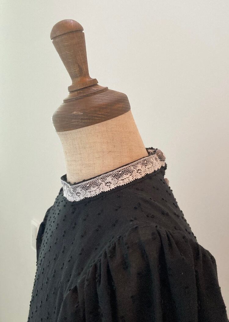 首元とカフスにレースをあしらったブラックドレスです。