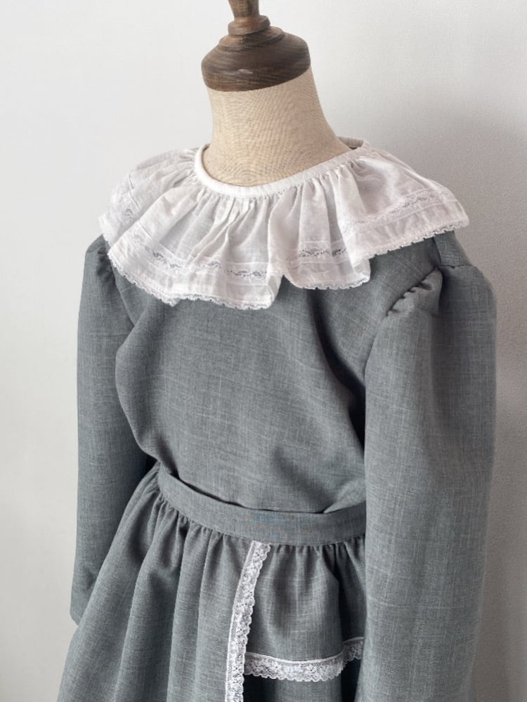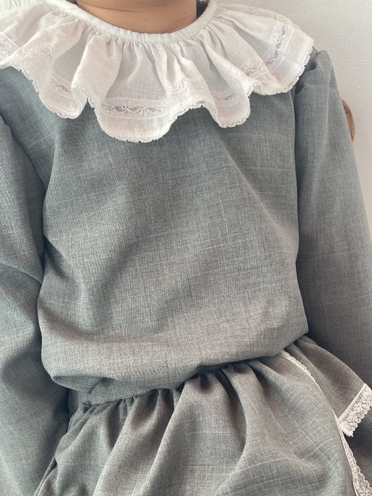 ブラウスにはピンタックとレースの切替をあしらったフリルの襟、