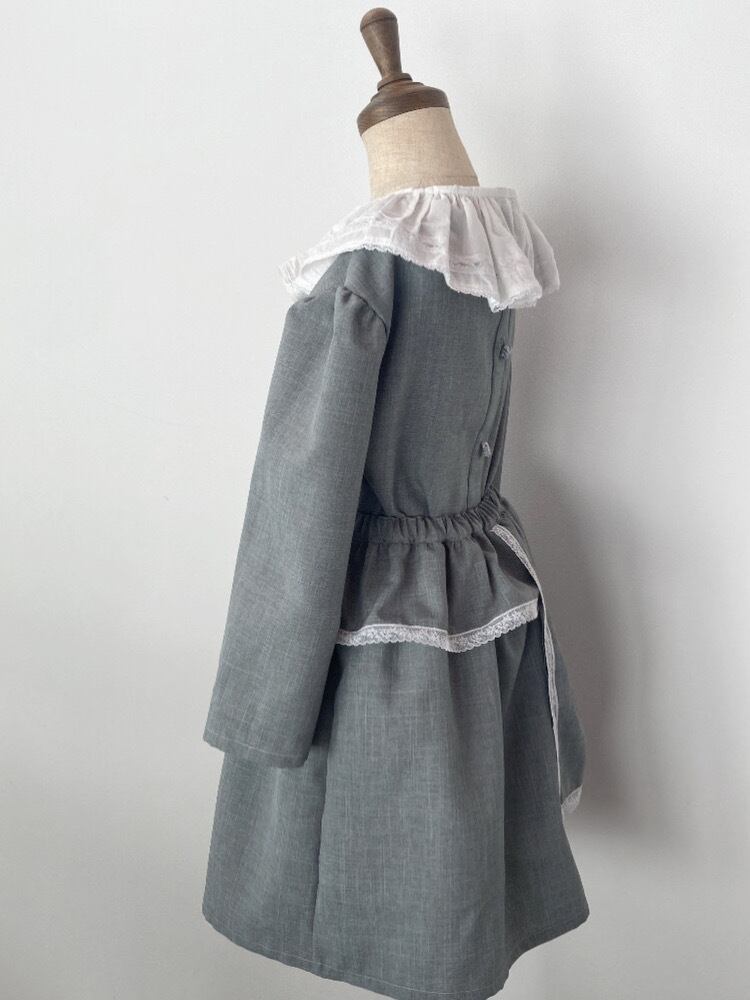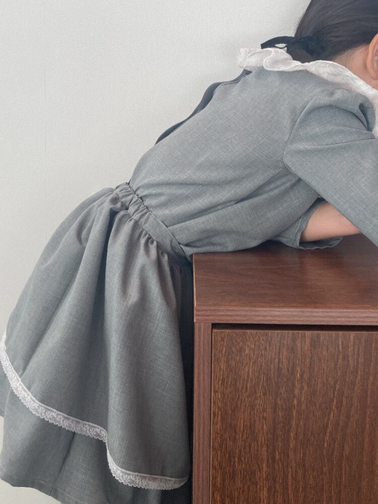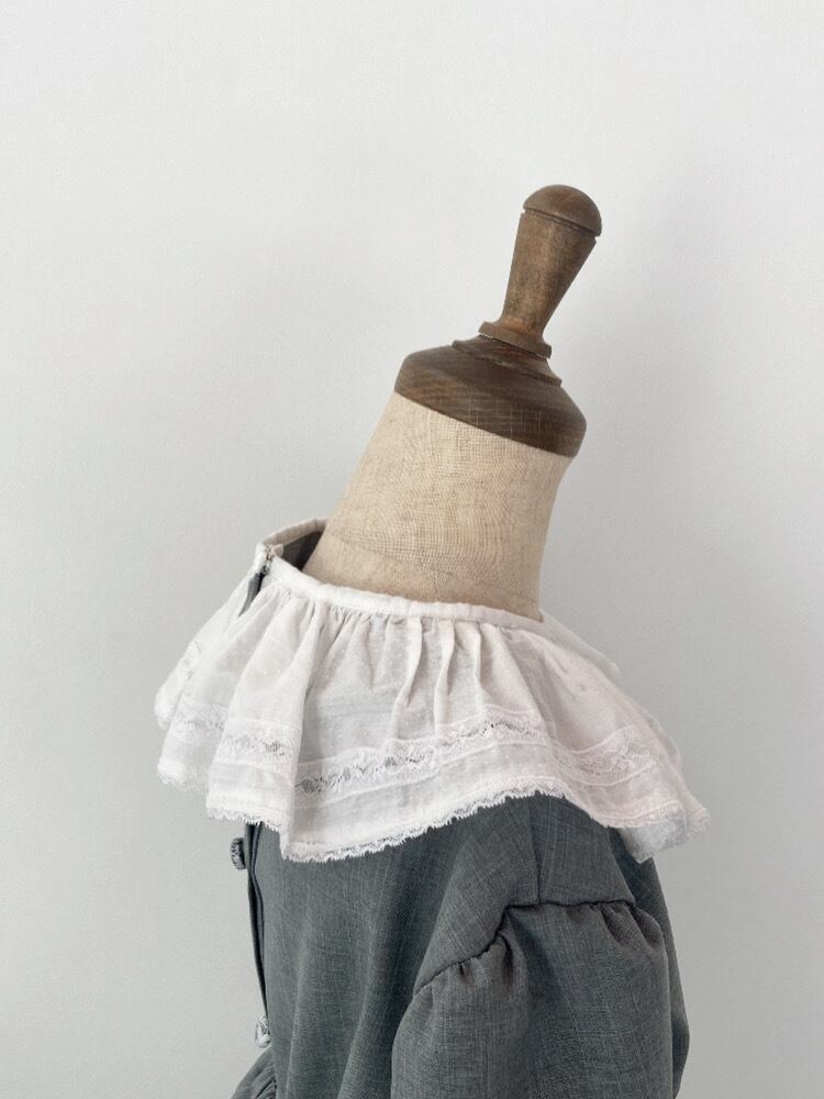 ブラウスにはピンタックとレースの切替をあしらったフリルの襟、