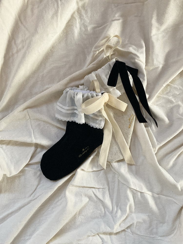 ブラックのベルベット、グレーのウールの本体生地にシルクコットンのフリルとフランスレースをあしらいました。