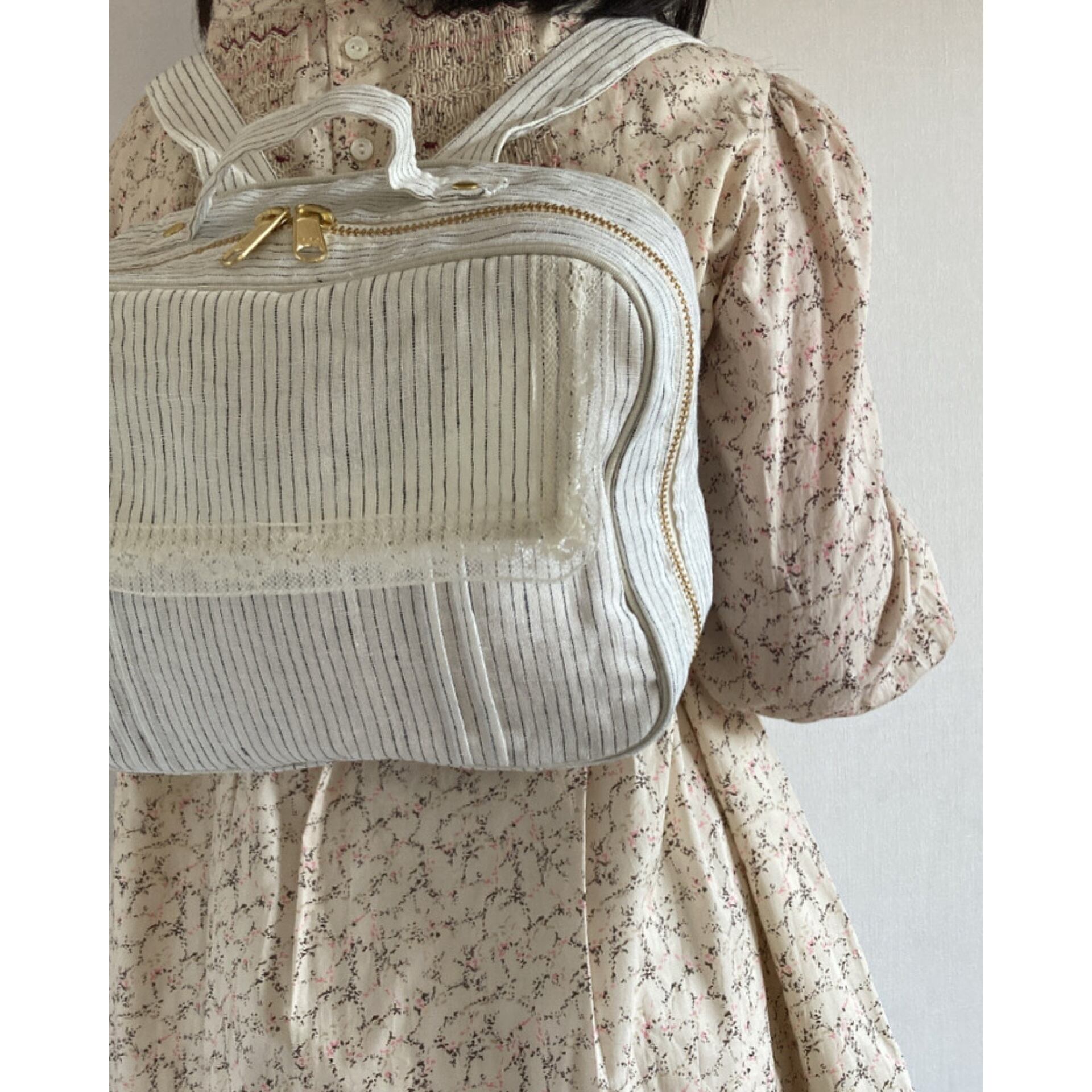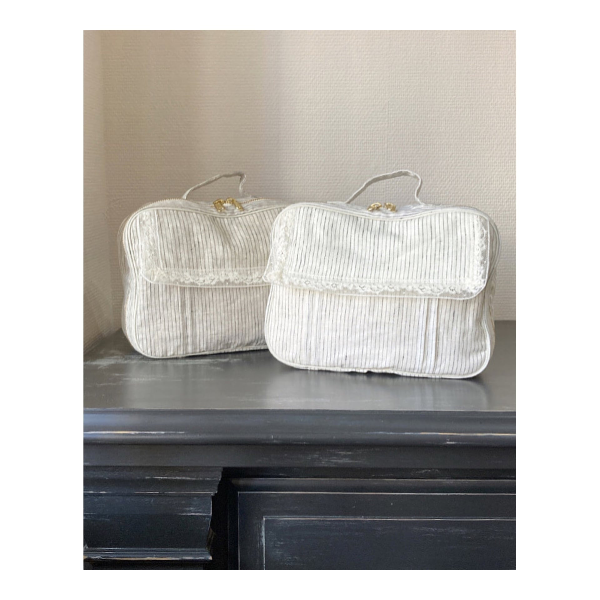 リネンの生地に、レースをあしらった装飾をつけたバニティポーチになります。