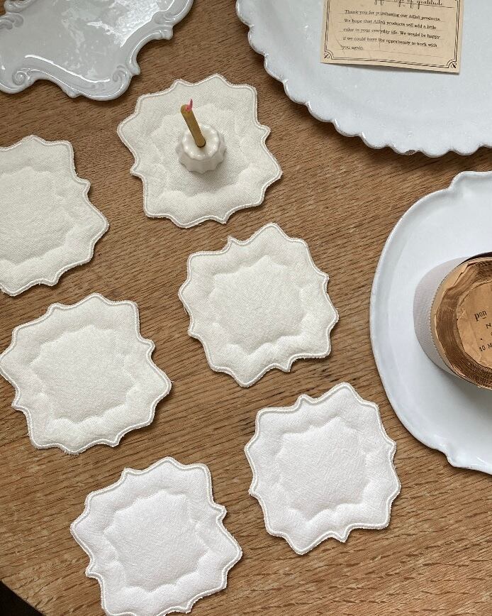 ホワイトコットンリネンの生地にアンティーク図案を刺繍してコースターに仕立てました。