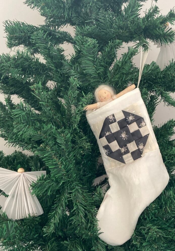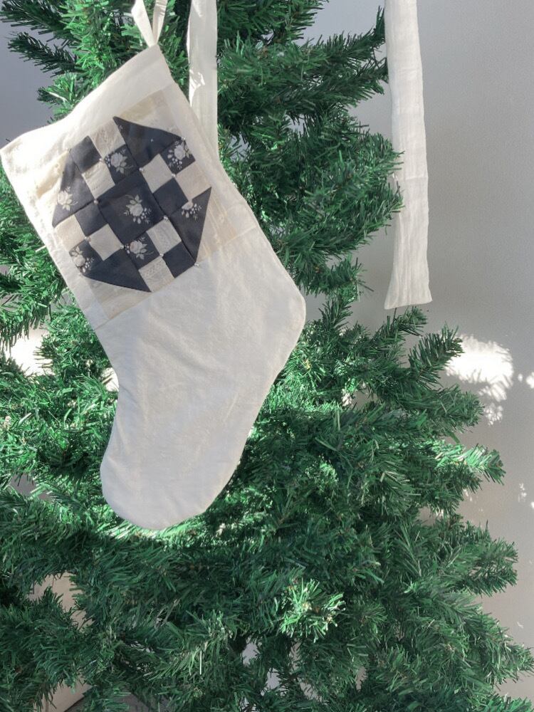 パッチワークにパールをあしらい綿麻の生地の靴下にあわせたクリスマスブーツになります。